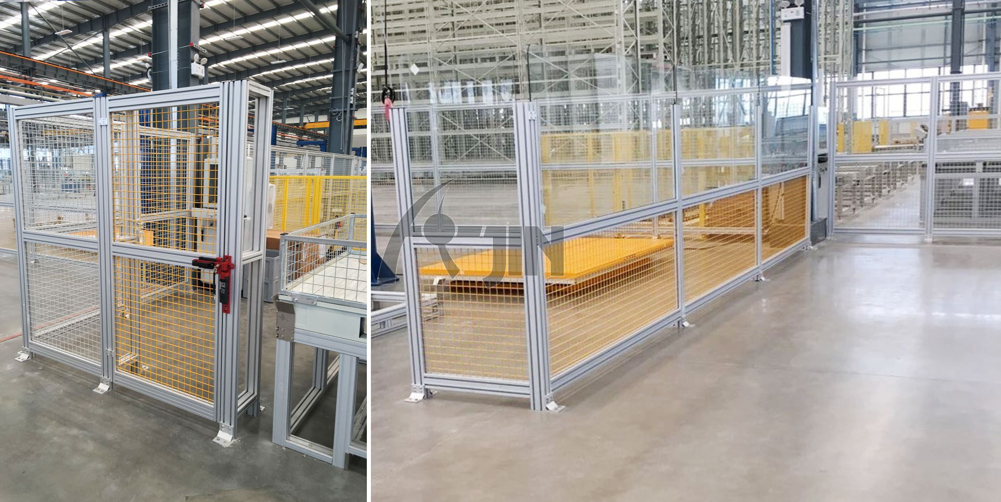 機械防護主用采用網和板兩種形式,常用于機器人外圍防護、汽車生產車間外圍防護、機械設備外圍防護等,可有效地保護設備,保障安全生產。